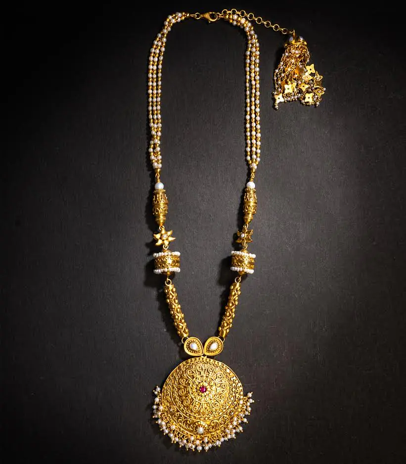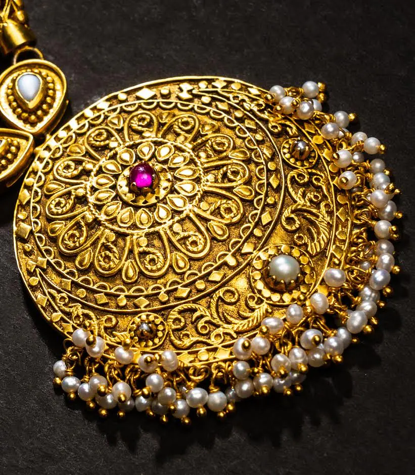 This detailed necklace is handcrafted in silver with gold plating and embellished with freshwater white pearls that encase the necklace. The pendant is centered with a semi-precious ruby stone and intricate hand-carved designs, bordered with delicate white pearls. The necklace is fastened by an adjustable chain and a clasp at the neck that is finished with a melange of gold plated and white pearl trinkets.