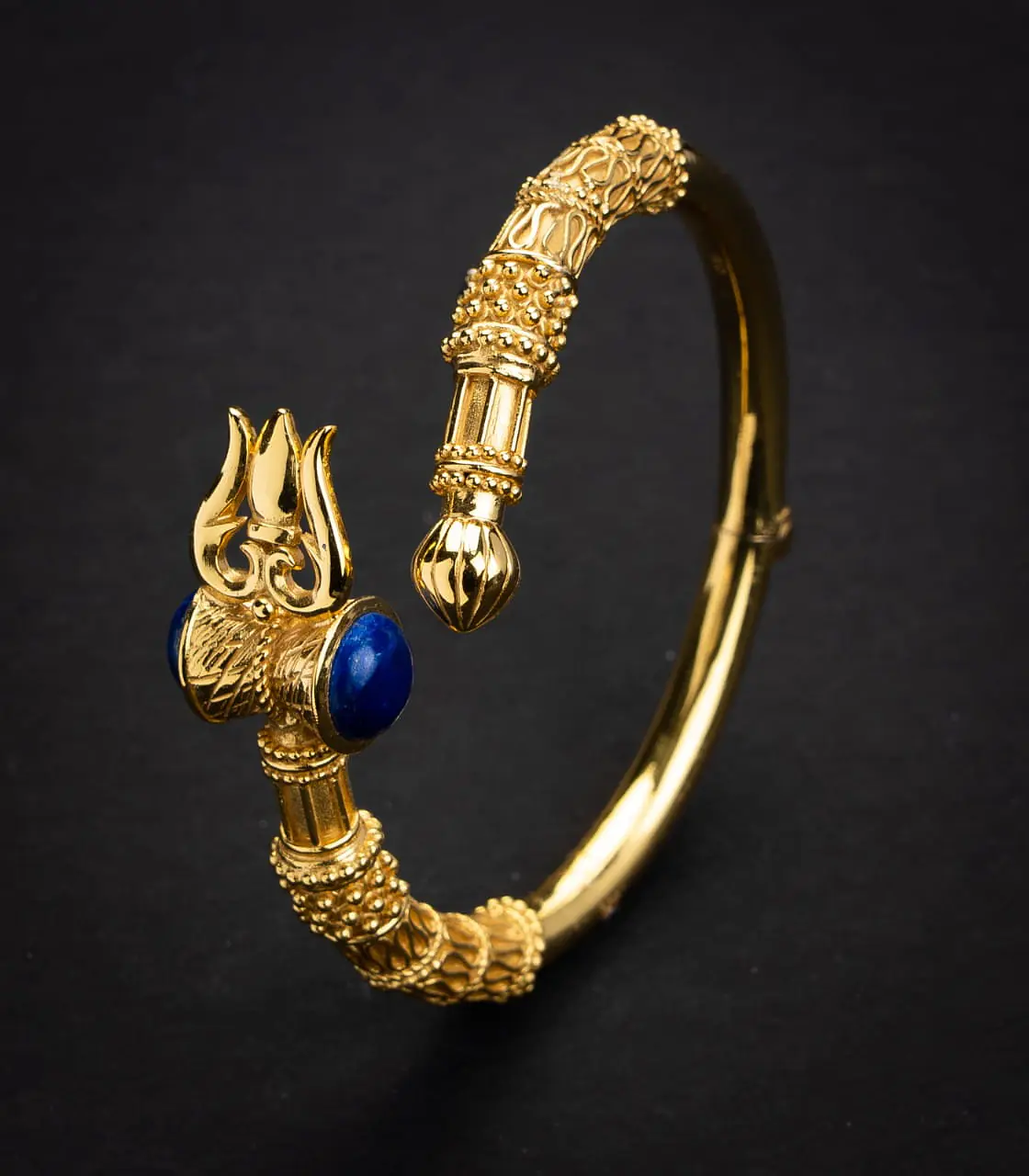 This exquisite piece is handcrafted in silver with gold plating and studded with sapphire blue stained glass gems at the cuffs. The bangle has been intricately hand-carved on either end with detailed patterns and shapes while the cuff has been designed to represent Lord Shiva-™s Trishul, with the drum embodying the sapphire blue stone. An intricate and delicate piece, perfect for all your festive and special celebrations.