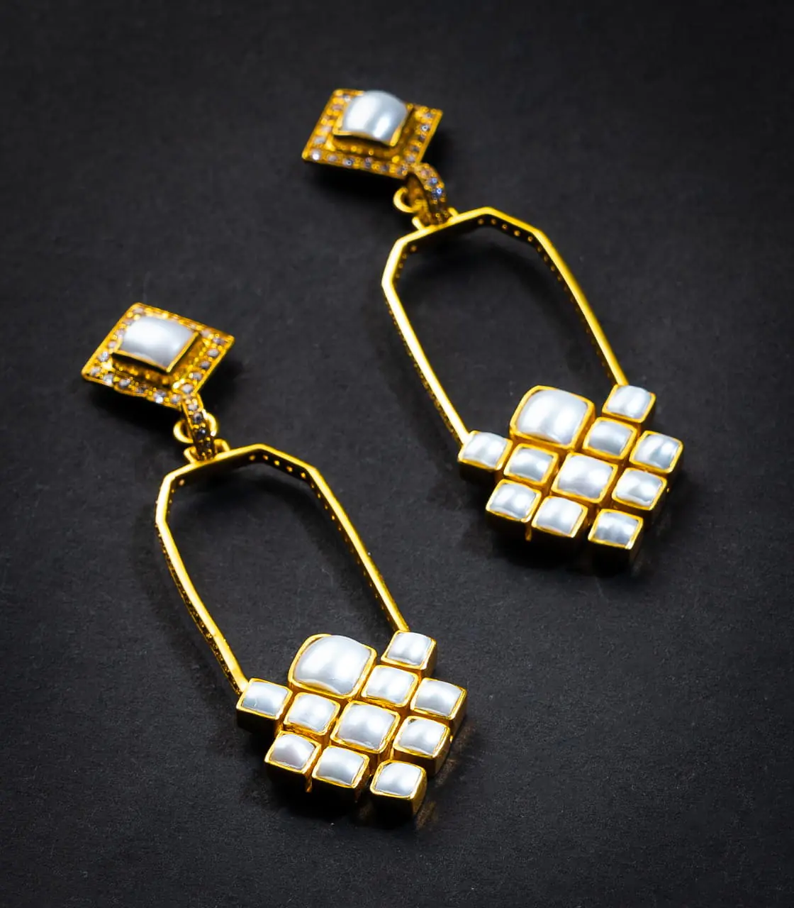 This modern pair of earrings are handcrafted in silver with gold plating and studded with patterned white stones. The simplistic design embraces delicate patterns and incorporates geometrically linked white glass stones. A contemporary pair, these earrings are supported by a simple and secure pushback.