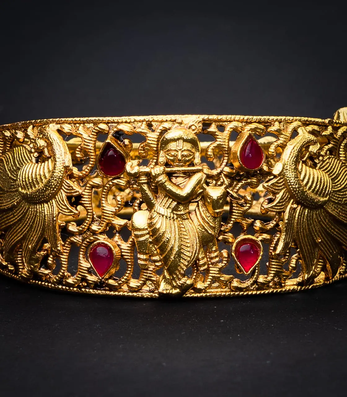 An exquisite traditional piece handcrafted in silver and gold plating studded with ruby stained glass gems. This traditional piece has been intricately carved to depict Lord Krishna playing his divine instrument, the bansuri, with peacocks on either side of him. The bangle is beautified with alternating ruby glass stones. A traditional and delicate piece, perfect for all your festive and special celebrations.