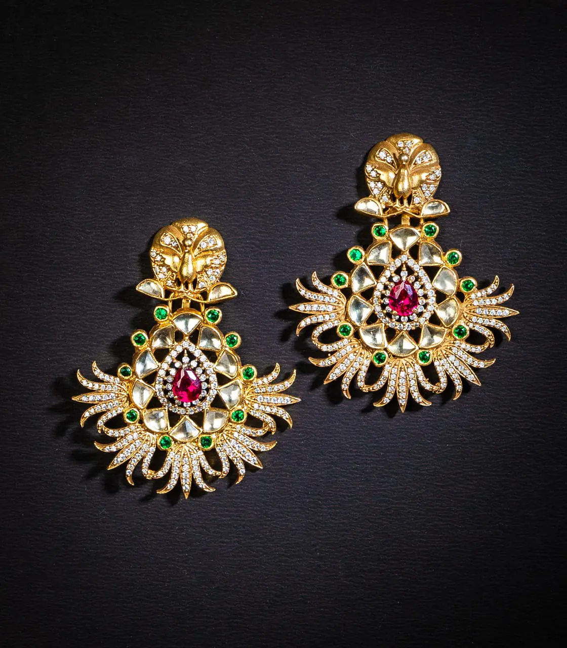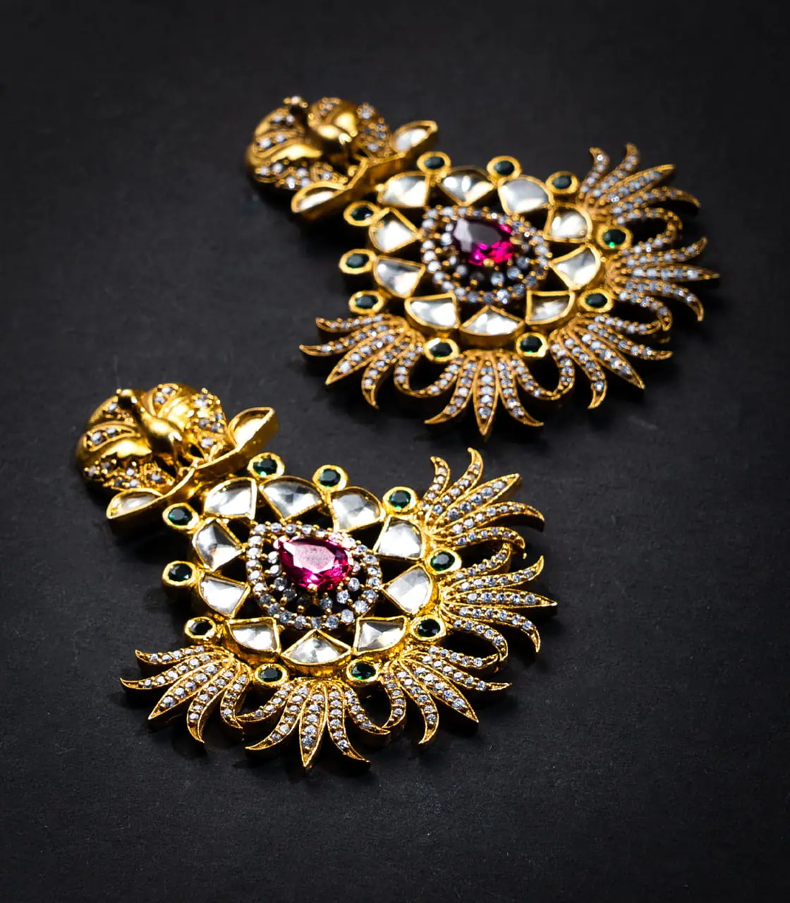 This exquisite pair of earrings are handcrafted in silver with gold plating and studded with purple, green and white and pure white stained glass gems. The design lays out hand-carved lotus flower motifs that surround a centered purple glass gem. Each earring is supported by a simple and secure pushback.