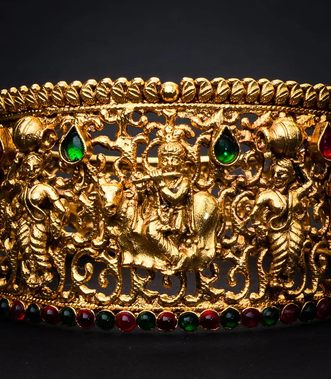 An exquisite traditional piece handcrafted in silver and gold plating studded with alternate ruby and emerald glass stained gems. This traditional piece has been intricately carved to depict Lord Krishna playing his divine instrument, the bansuri, with his avatars on either side. The bangle is beautified with alternating ruby and emerald stones on the border. A traditional and delicate piece, perfect for all your festive and special celebrations.
