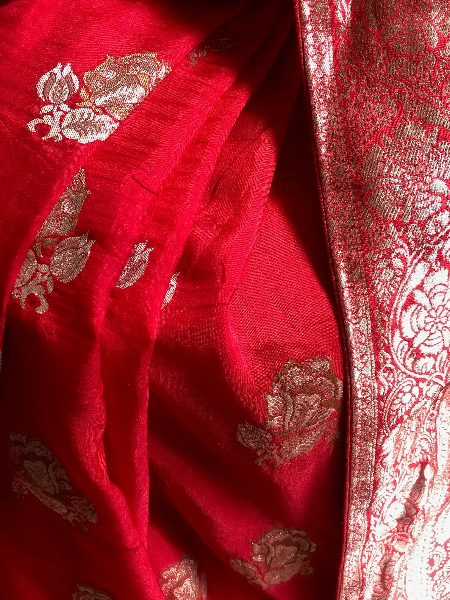 Adorn yourself in elegance with this stunning red Banarasi saree, showcasing intricate weaving of beautiful rose motifs in muted gold threads. Exuding an old-world charm, this exquisite piece is perfect for special occasions, evoking romance and sophistication.