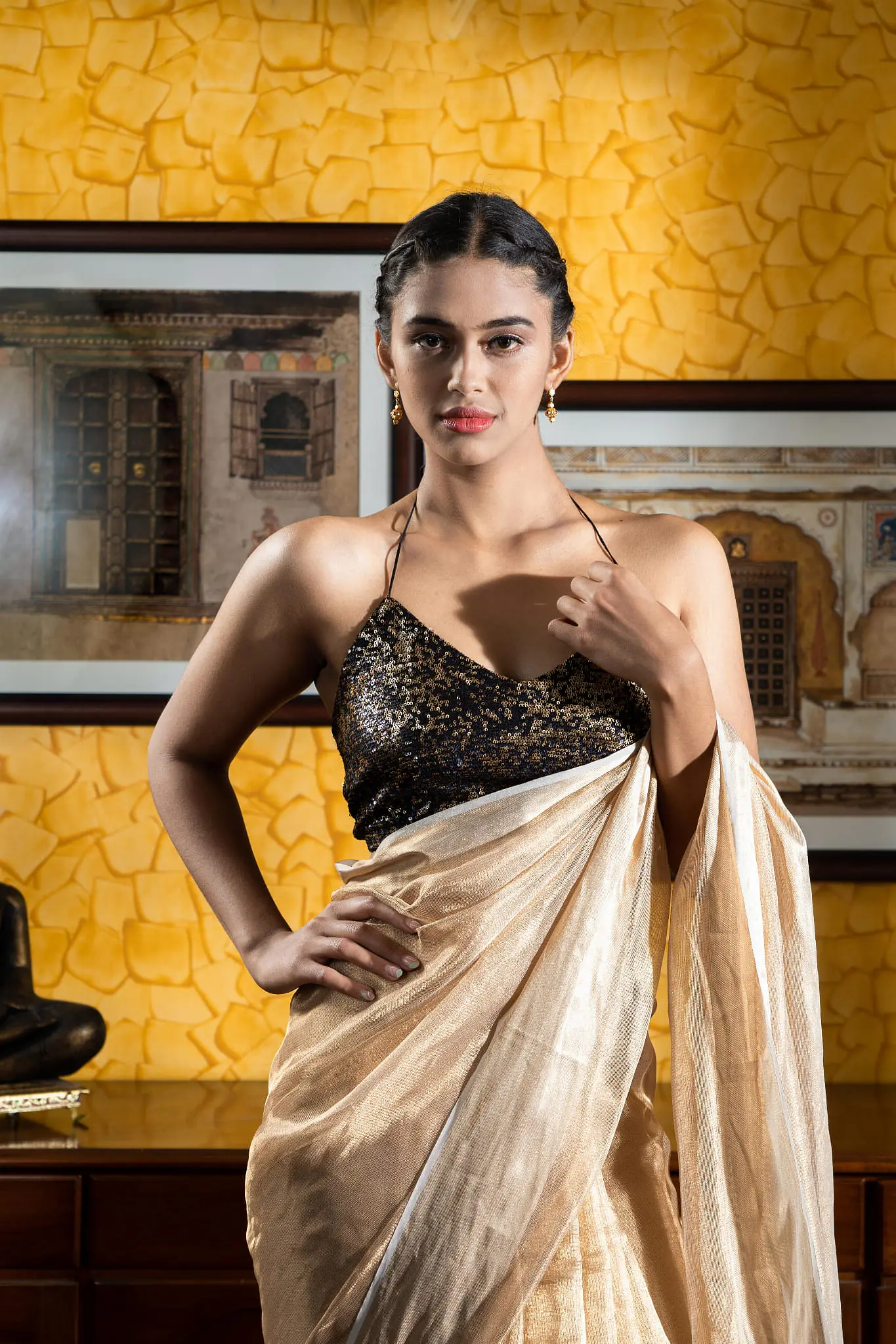 Exude elegance with this breathtaking lightweight sheer net tissue saree, featuring an enchanting gossamer quality when draped. The light gold base shimmers with subtle gold accents, beautifully complemented by a dense, muted gold border, perfect for making a statement on special occasions.