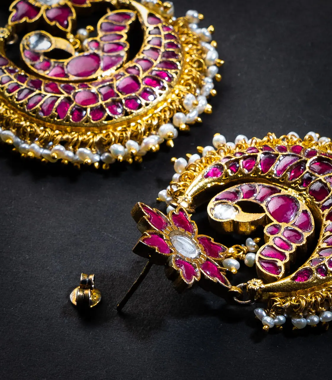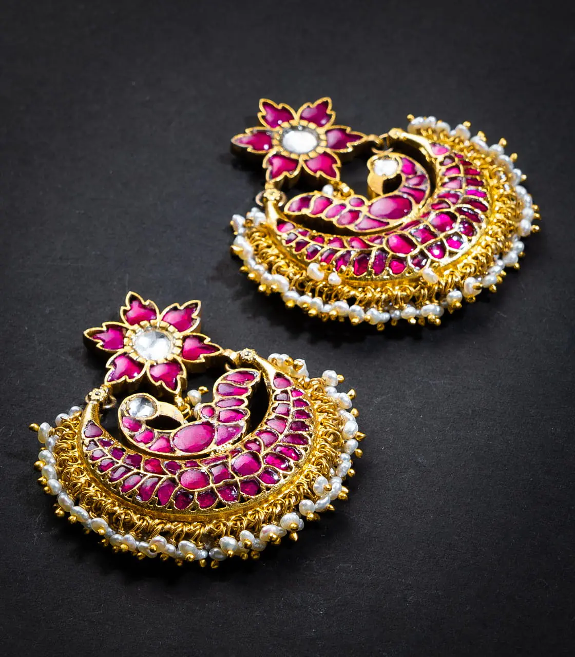 These intricate earrings are handcrafted in silver with gold plating and embellished with pink stained glass gems. Each earring has a flower motif which descends into a pink stone studded peacock. The piece is bordered with small fresh water pearls that are bunched along the crescent shaped lower half. Each earring is supported by a pushback for simple and secure fastening.
